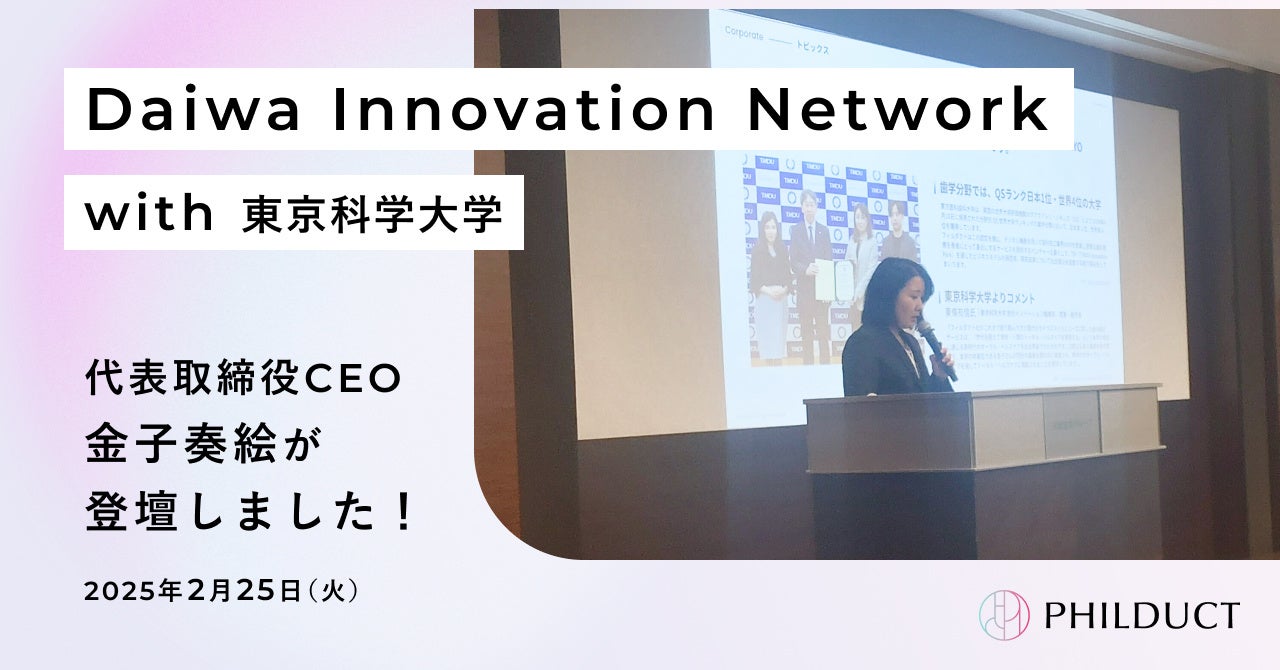 株式会社フィルダクト(本社:東京都港区、代表取締役CEO:金子奏絵)は、2025年2月25日に開催された「第142回 Daiwa Innovation Network with 東京科学大学」において、代表の金子奏絵が登壇したことをお知らせします。本イベントは、大和証券グループが開催するイノベーション推進プログラムであり、最先端技術を活用するスタートアップが7社集結しました。