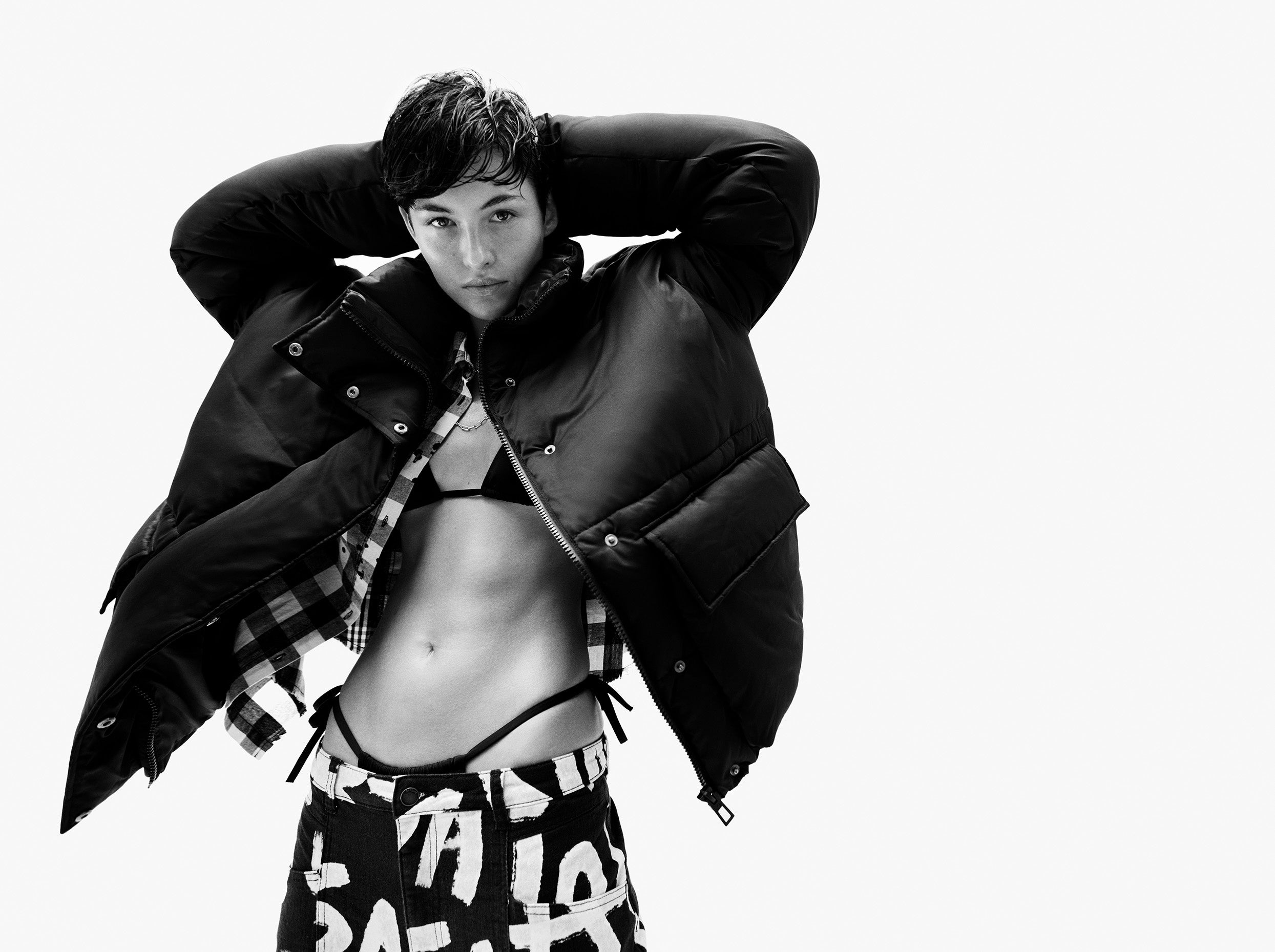 左のイメージは、ボリュームのあるパファージャケットが、インパクトのある90年代テイストのレタープリントパンツとチェックシャツを引き立てています。