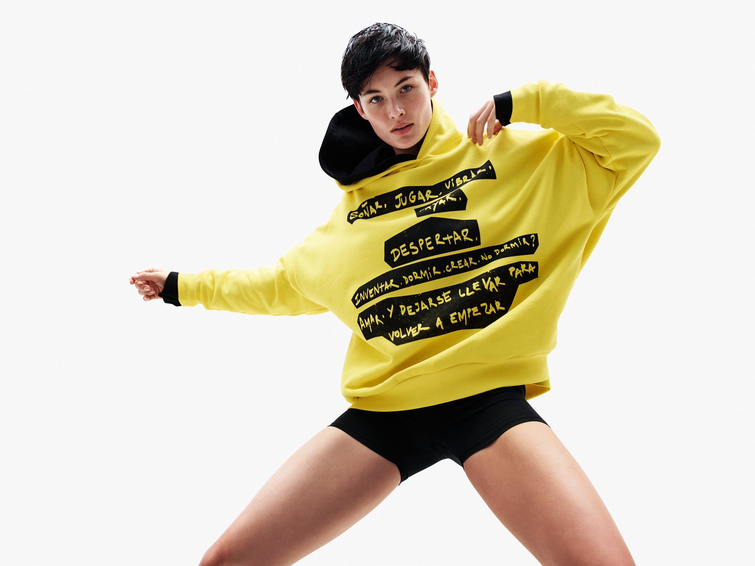 黄色いスウェットには、デシグアルのDNAである力強いメッセージが書かれています。