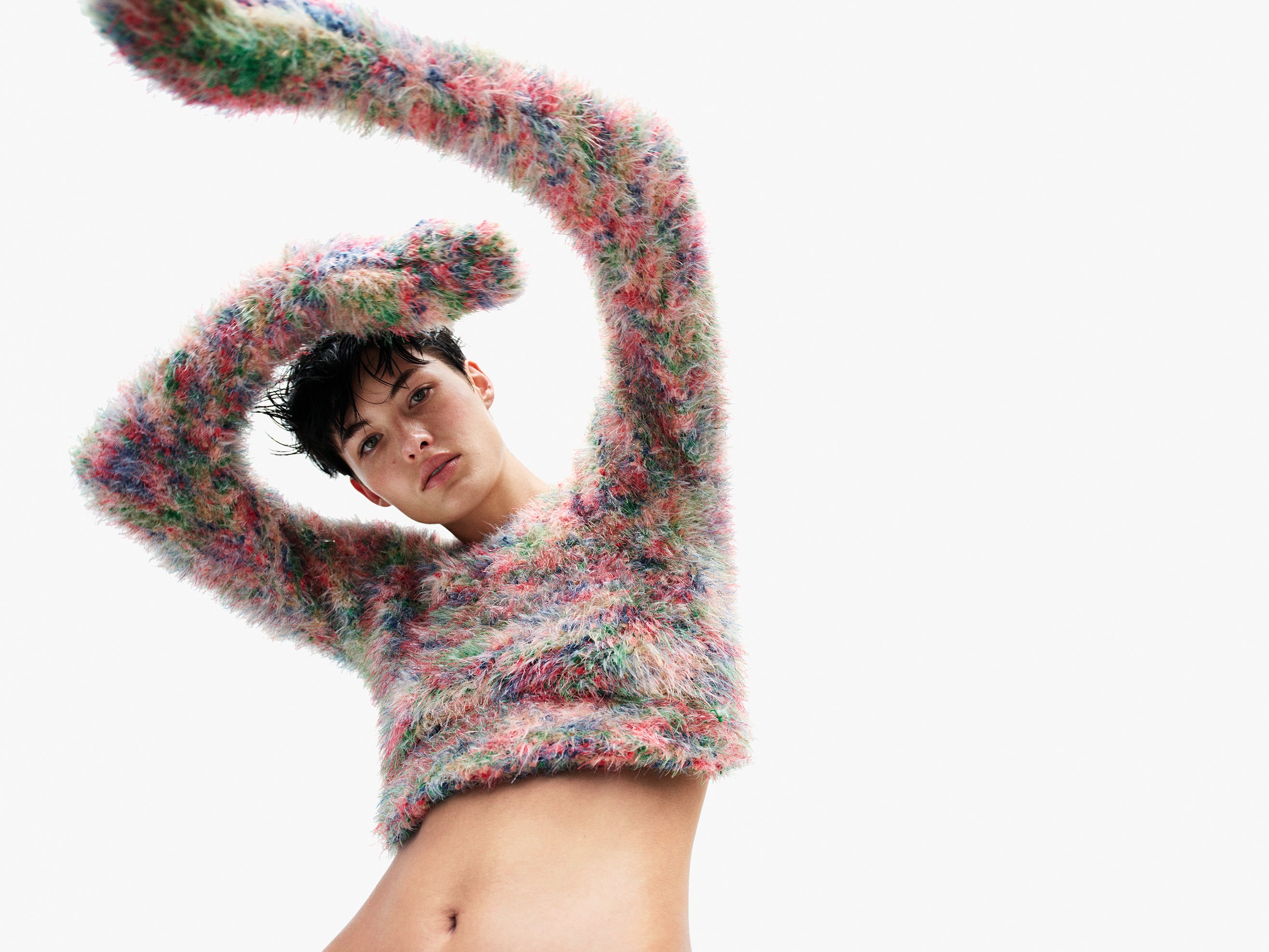 ファーの質感が特徴的なフワフワのマルチカラーセーターが目を引きます。