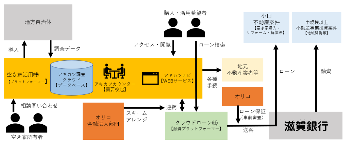 今回のオリコ・空き家活用株式会社との三社連携で実現した空き家活用に利用できる無担保ローン(以下「アキカツローン」)の仕組みに、今回の提携を通じて滋賀銀行が参画することになり、社会問題化している空き家問題にいち早く解決策として提供いただくことともなりました。
