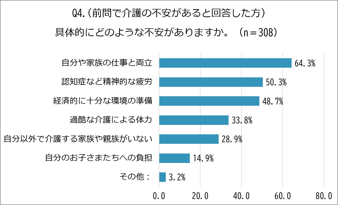 介護に対する不安の理由として、「自分や家族の仕事と両立(64.3%)」や「認知症など精神的な疲労(50.3%)」、「経済的に十分な環境の準備(48.7%)」をあげる方が多く、自分の仕事と介護の両立を主に、生活が大きく変わることが不安と考える人が多いことが分かりました。