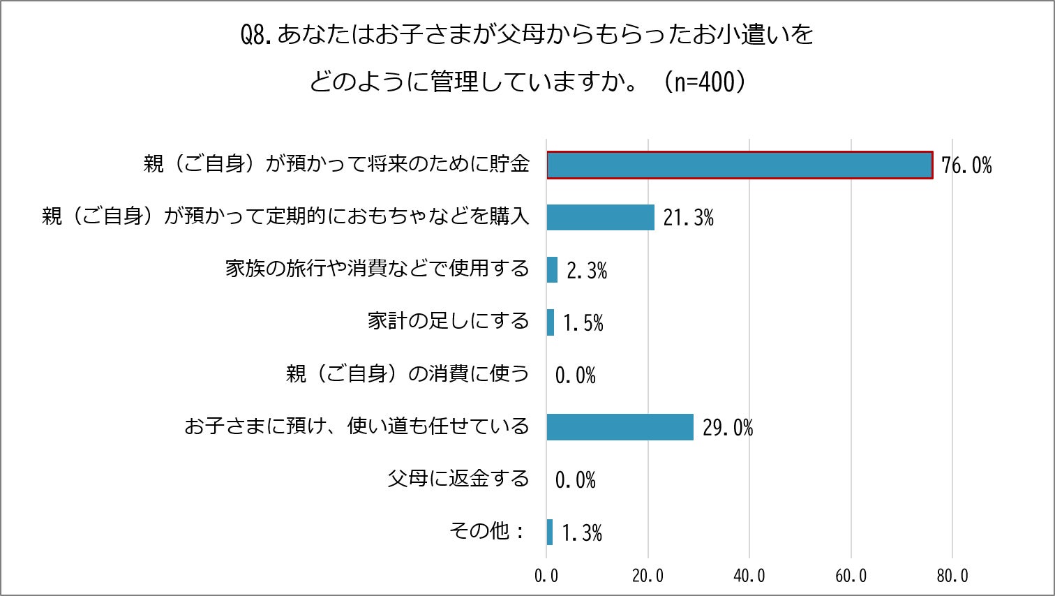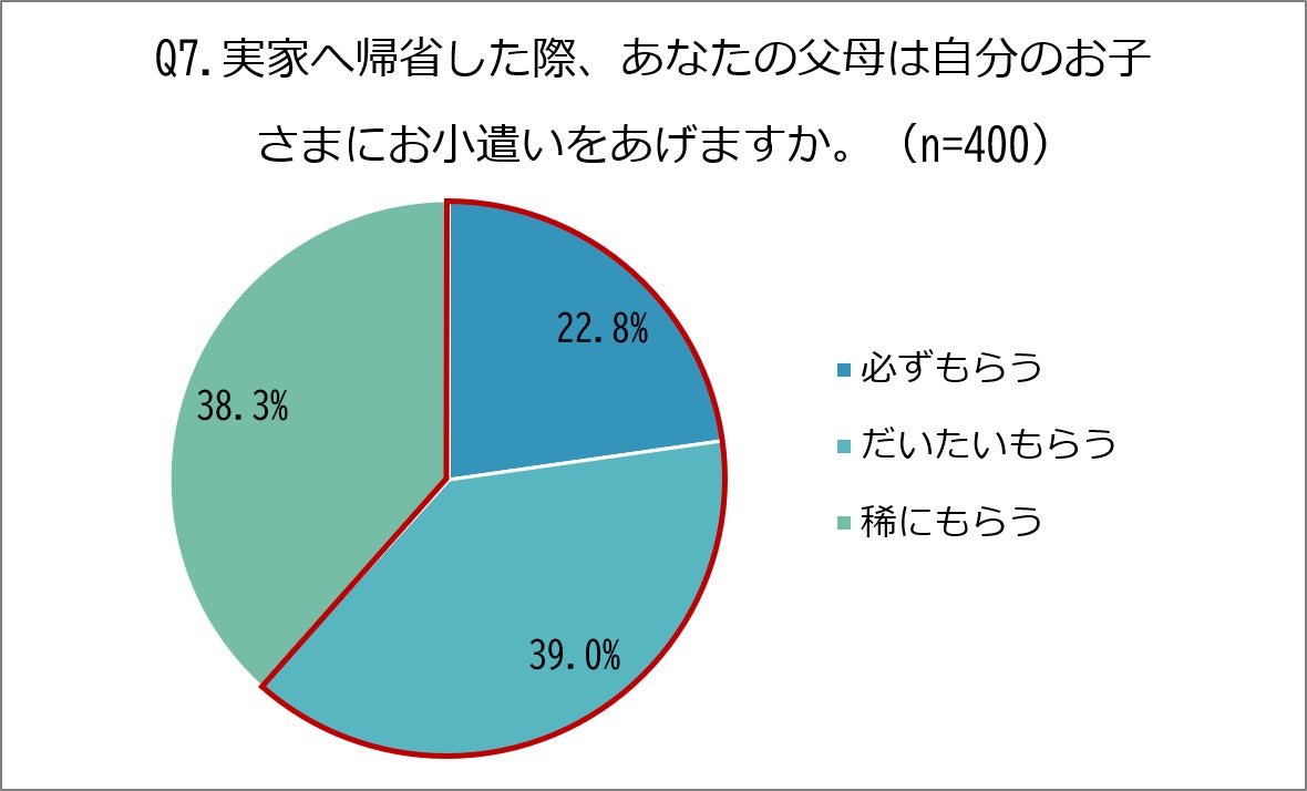 「帰省の際、孫(自分の子ども)におこづかいをもらいますか?」と質問したところ、22.8%が必ずもらう、39.0%がだいたいもらうと回答。全体の約6割はおこづかいをもらっていることがわかります。ただし、子どもにもらったおこづかいについては、「預かって将来のために貯金(76.0%)」とほとんどの親が、子どもの将来のために残しておきたいという未来志向であることがわかりました。