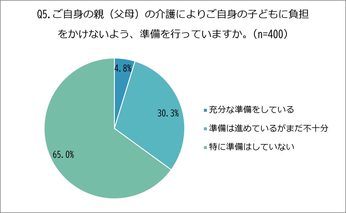 一方、「将来、ご自身の親(父母)の介護によりご自身の子どもに負担をかけないよう、準備を行っていますか。」という質問で、「充分な準備をしている」と回答したのはわずか4.8%という結果となりました。