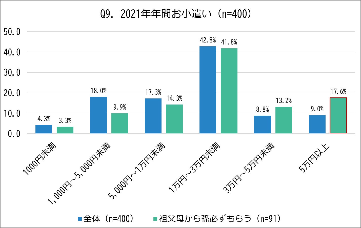 お子さまの年齢別の場合、未就学児では平均17,570円と全体と比較すると2,300円も高い結果に。おこづかいの頻度別の場合、必ずもらっている方に絞ると17.6%が5万円以上と高額であることが分かります。ちなみに、2021年のお年玉の平均は9,222円となりました。