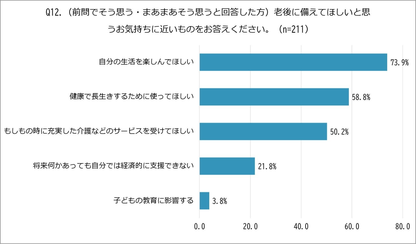 今回の調査では、介護に対して7割以上の人が不安を抱えており、深刻な問題であることが分かりました。孫へのおこづかいの額は日常のおこづかいより高く(Q10)、孫へのおこづかいより“自分の老後の備えにあててほしい”と思っている方が高い割合を占めました。一方、もらったおこづかいの使い道については、“もしもの貯蓄”に回している家族が多いことから、将来への不安が大きいことも考えられます。