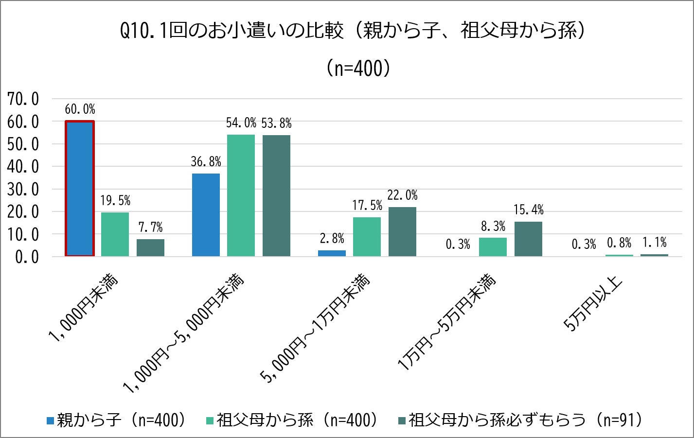 親から子どもへのおこづかいは60.0%が1,000円以下に対し、祖父母から孫は1,000円~5,000円未満が54%。また、特徴としておこづかいを毎回もらう人ほど1回の平均のおこづかいが高額であることが分かっており、1回のおこづかいが1万円以上は15.4%ということがわかりました。