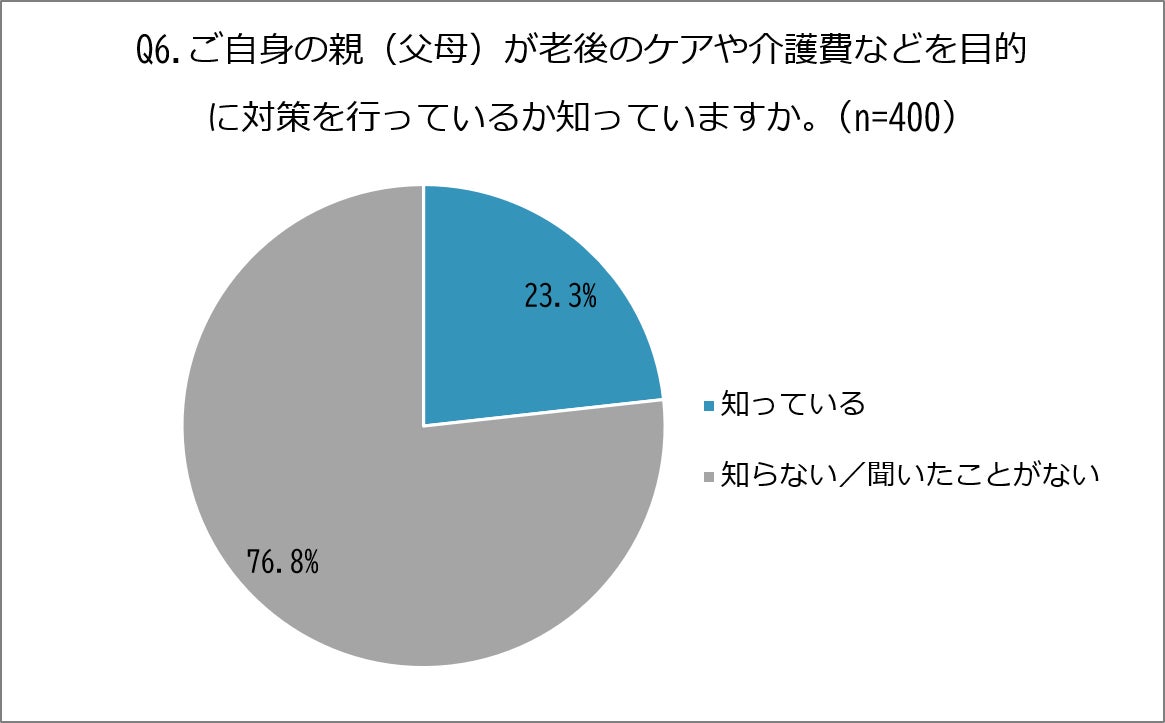 また、「ご自身の親(父母)が老後のケアや介護費用などを目的に対策を行っているか知っていますか。」という質問でも、「知っている」と回答したのは23.3%と少ない結果となっており、今後増えていく可能性のある課題も家族間で準備や共有ができていないことがわかりました。