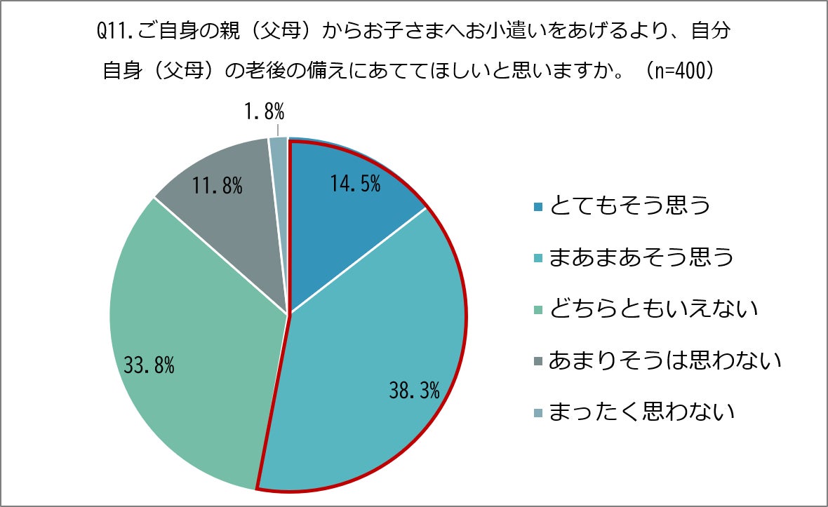 「ご自身の親(父母)に孫のおこづかいより老後の備えにあててほしいですか?」という質問では、実に52.8%が「そう思う」と回答しました。理由として「自分の生活を楽しんでほしい(73.9%)」、「健康で長生きするために使ってほしい(58.8%)」などの意見の一方、2割以上が「将来何かあっても自分では経済的に支援できない」といったシビアな意見も浮き彫りとなりました。