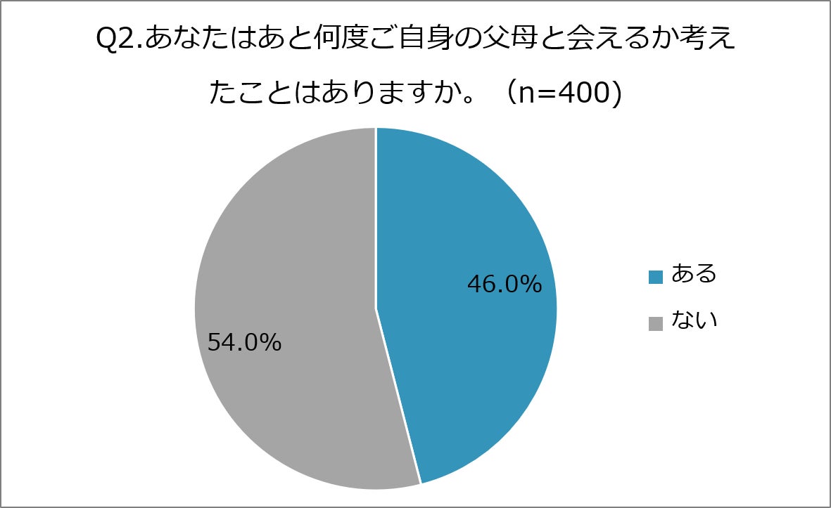 実際に、「あなたはあと何度ご自身の父母と会えるか考えたことはありますか。」という問いには、46%があると回答し、未就学児を持つ親については52.9%と半数を超えることから、幼い孫が、家族で会う機会を考えるきっかけになっていることがうかがえます。