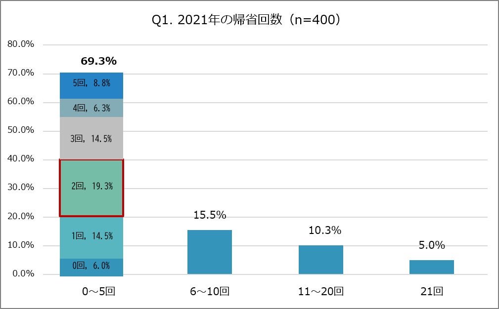 しかし、コロナ禍で帰省回数が減ったと回答したのは59.5%と半数以上となり、2021年に家族で帰省した回数を調査したところ、2回と回答した割合(19.3%)がもっとも多く、5回以下が全体の約7割を占める結果となりました。
