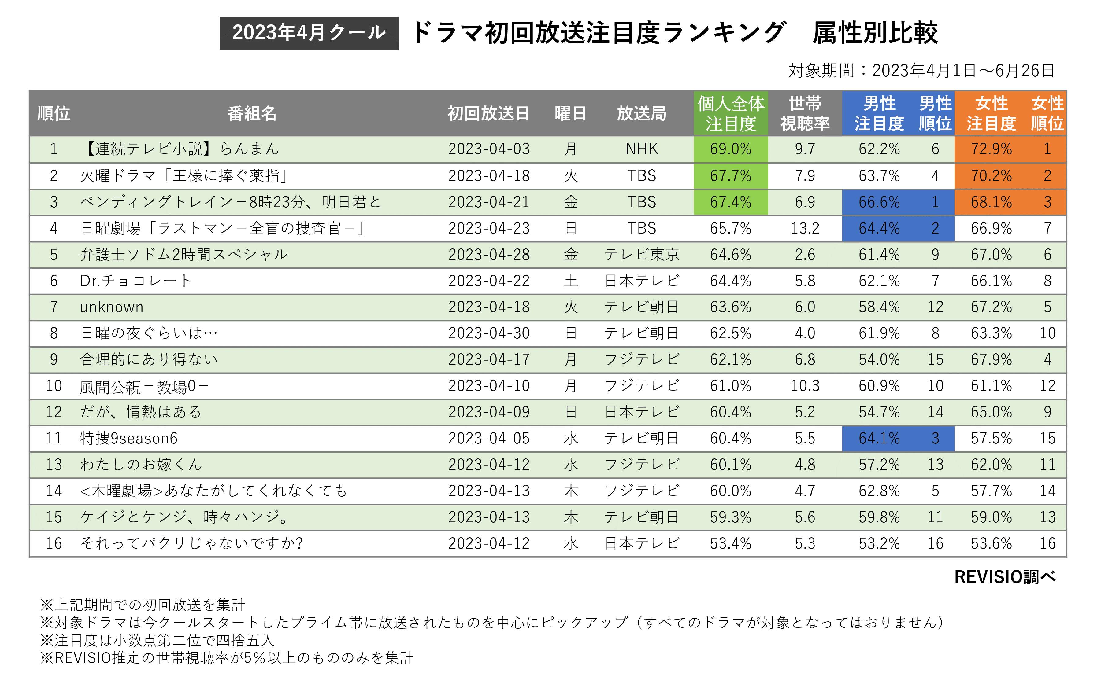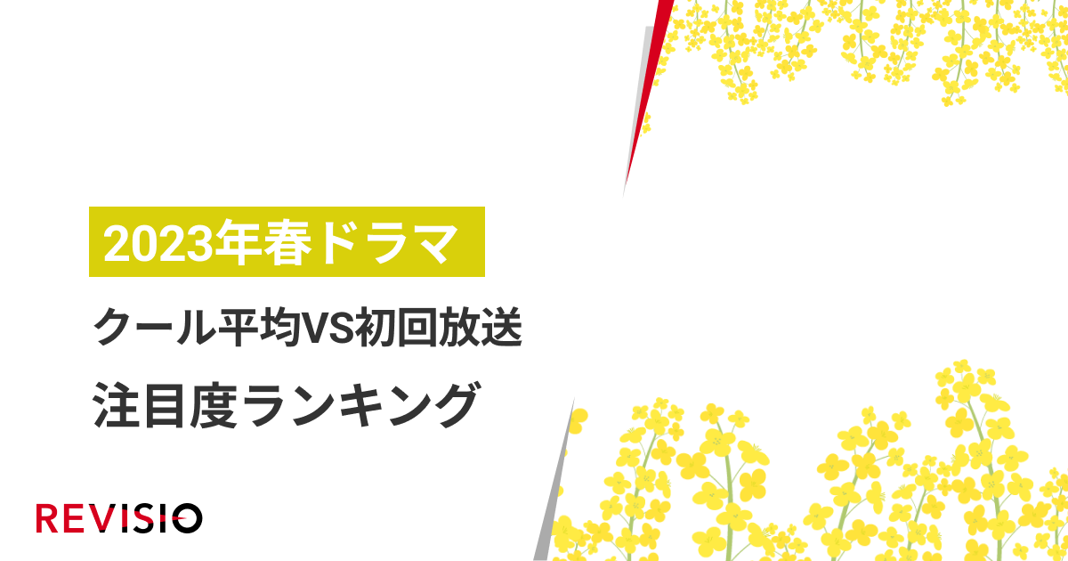 ご家庭に人体認識技術を搭載した機器を設置し、テレビの「視られている量」を測るREVISIO株式会社(旧TVISION INSIGHTS、所在地:東京都千代田区、代表取締役社長:郡谷 康士、以下REVISIO)は、2023年4月にスタートした春ドラマについて、初回放送と4月クールの平均注目度ランキングを作成し、初回放送から視られ方に違いが生じたのかについて分析いたしました。注目度の値が高いことは、テレビの前の視聴者がくぎづけになっていたことを表します。