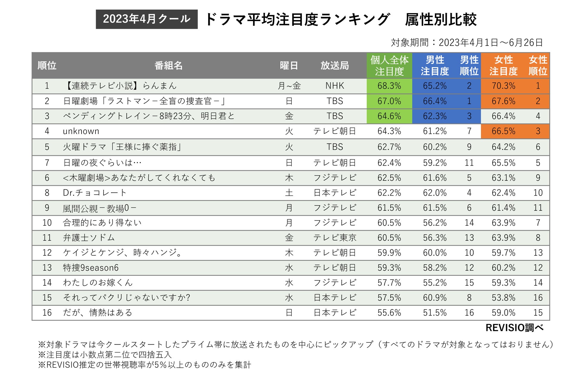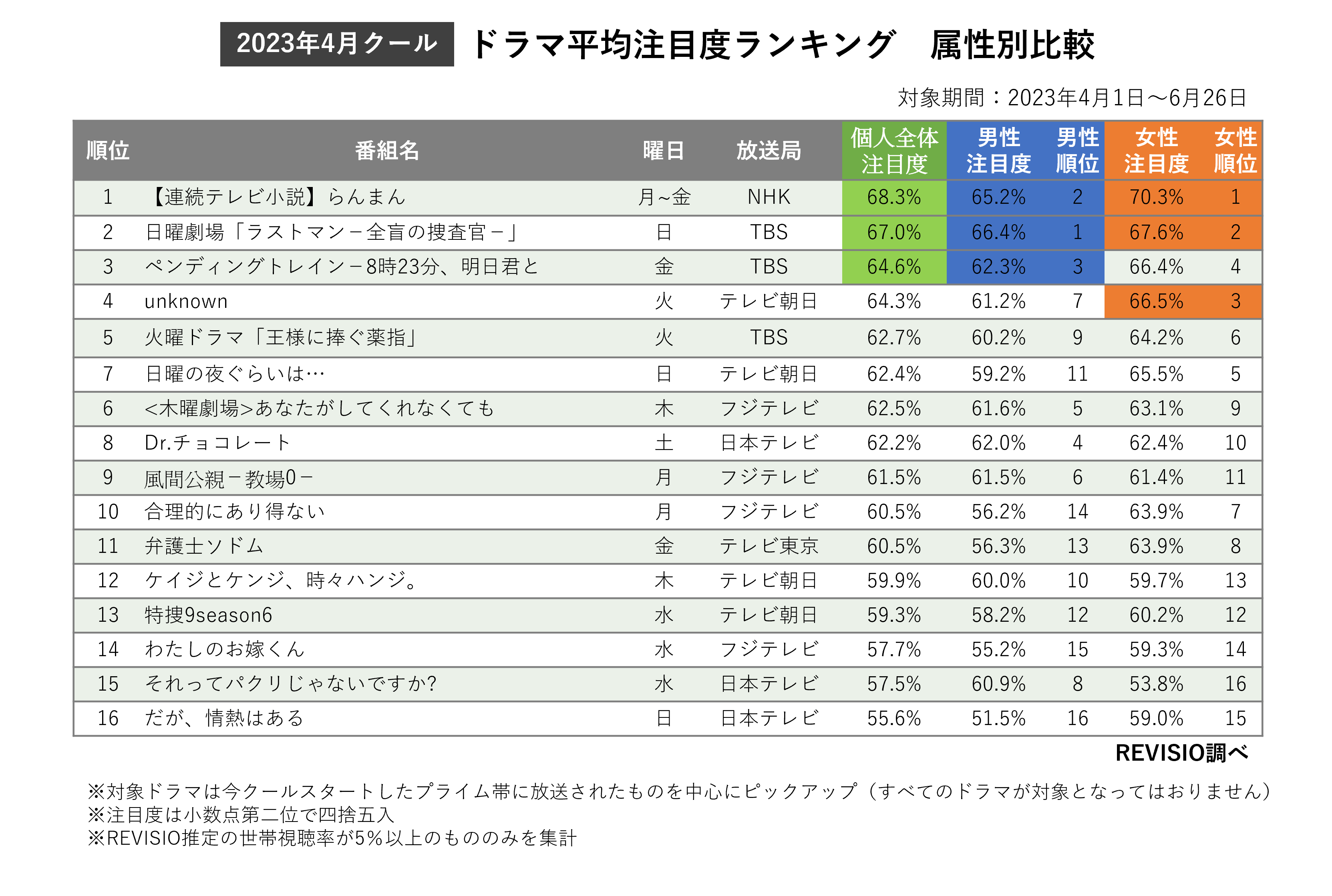 その結果、個人全体での1位はNHKの『【連続テレビ小説】らんまん』でした。このドラマは女性のランキングでも1位となっていました。2位はTBSの『日曜劇場「ラストマン−全盲の捜査官−」』で、男性ランキングでは1位となっていました。3位はTBSの『ペンディングトレイン−8時23分、明日君と』でした。上位にランクインした番組は、男性ランキングと女性ランキングでも上位に入りました。