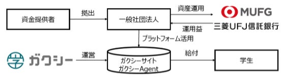 具体的には、資金提供者から寄附・拠出金により一般社団法人に資金を集め、三菱UFJ信託銀行にて運用することで、運用益を原資とした給付型奨学金を創設します。その上で、日本最大級の奨学金情報サイト「ガクシー」を通じて多くの若者に周知し、スマートフォン・パソコンから手軽に応募者を集め、さらに従来手間のかかりやすい奨学金運営も、奨学金運営管理システム「ガクシーAgent」によって選考や支給を効率的に進めてまいります。