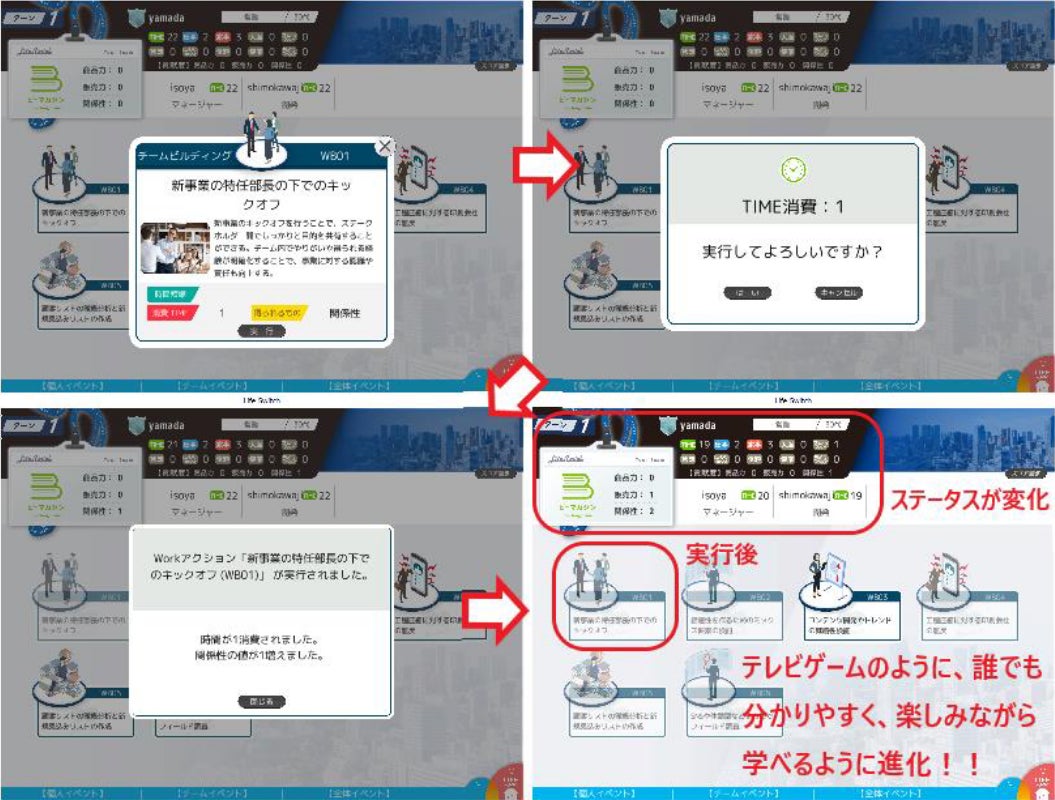 ライフ・スイッチは完全オンラインで対応可能でしたが、コロナ禍を経て、これまでITツールをあまり活用していなかった方にもオンラインでご利用いただく機会が増えました。そのため、ゲームを一画面完結で操作できるなど、分かり易いユーザーインターフェースを導入し、参加者のITスキルを問わずゲームへの没入感やエンターテインメント性を高めることを実現しました。その結果、オンライン・オフラインの双方を用いるハイブリッド形式も簡単に実施でき、ゲーム中に集中力を切らすことなく、盛り上がることが可能となりました。