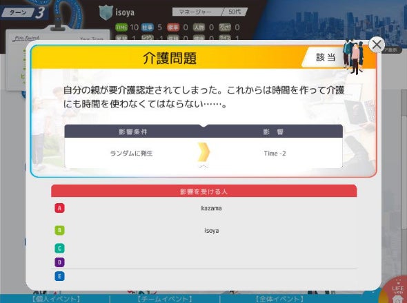 - 介護に携わる可能性があることにより明確に気づくため、ランダムで家族が介護認定されて持ち時間が減少する、イベント「介護問題」を追加