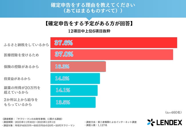 さらに確定申告をする予定があると回答した方に「確定申告をする理由を教えてください(あてはまるものすべて))」と聞いたところ、『 ふるさと納税をしているから(37.6%)』が最多でした。