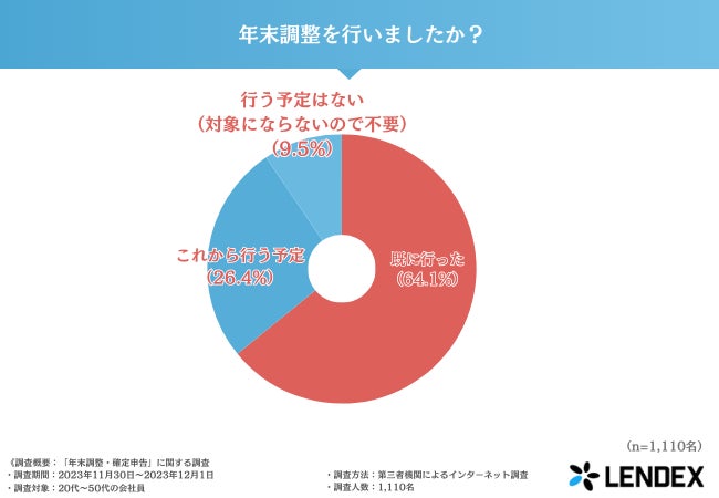 そこで、12月1日時点で「年末調整を行いましたか?」と聞いたところ、『既に行った(64.1%)』と、約3人に2人は既に行っていたそうです。