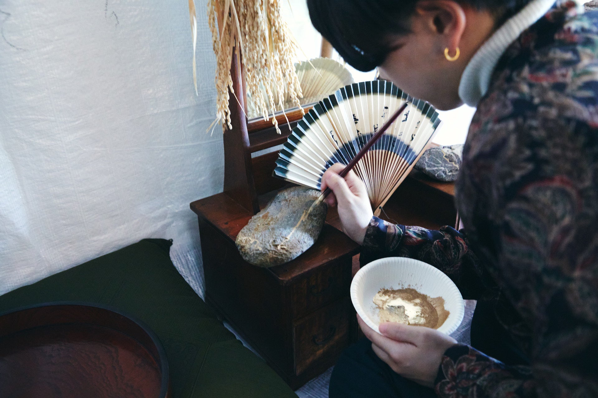 祖母の部屋で遊んでいた遠い記憶。回想するたびに思い出す古い家具の置かれた部屋、畳のにおい、そしておままごとに使った石たち。エースホテル京都の客室のドアは幼少期の回想に繋がる扉。京都で拾った石は祖母との思い出のかけら。彼女の短歌は、現在と過去(回想)を結ぶ。展示を通して幸せと愛について自分と向き合い、そして紡がれる言葉はやさしく、どこか懐かしい。