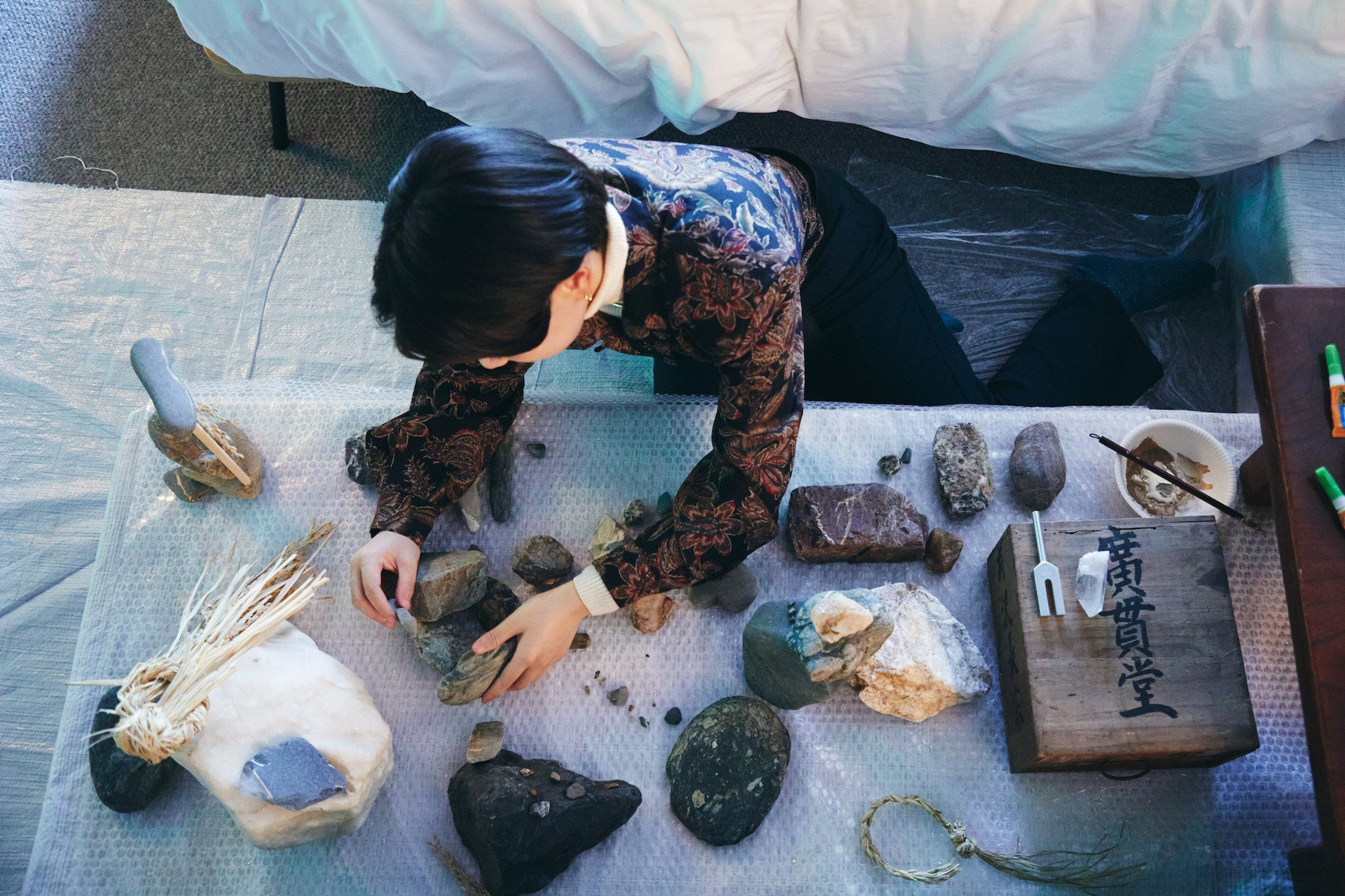 渡邉の作品は、短歌をつくることから始まります。その短歌に見合う石をシーグラス(ガラス)や顔料などで装飾し、人に見立てて短歌で命(名)を宿します。今回の展示テーマは、「In living, we find love「生きてることが、愛だった」。祖母の部屋で遊んでいた遠い記憶。回想するたびに思い出す古い家具の置かれた部屋、畳のにおい、そしておままごとに使った石たち。祖母の部屋をエースホテル京都のロビーギャラリーで再現します。エースホテル京都の客室のドアは幼少期の回想に繋がる扉。京都で拾った石は祖母との思い出のかけら。「昔の思い出を回想し、幸せと愛について向き合う時間。エースホテル京都での展示を通して、幸せと愛について五感に訴える空間にしたい」と渡邉は意気込みます。