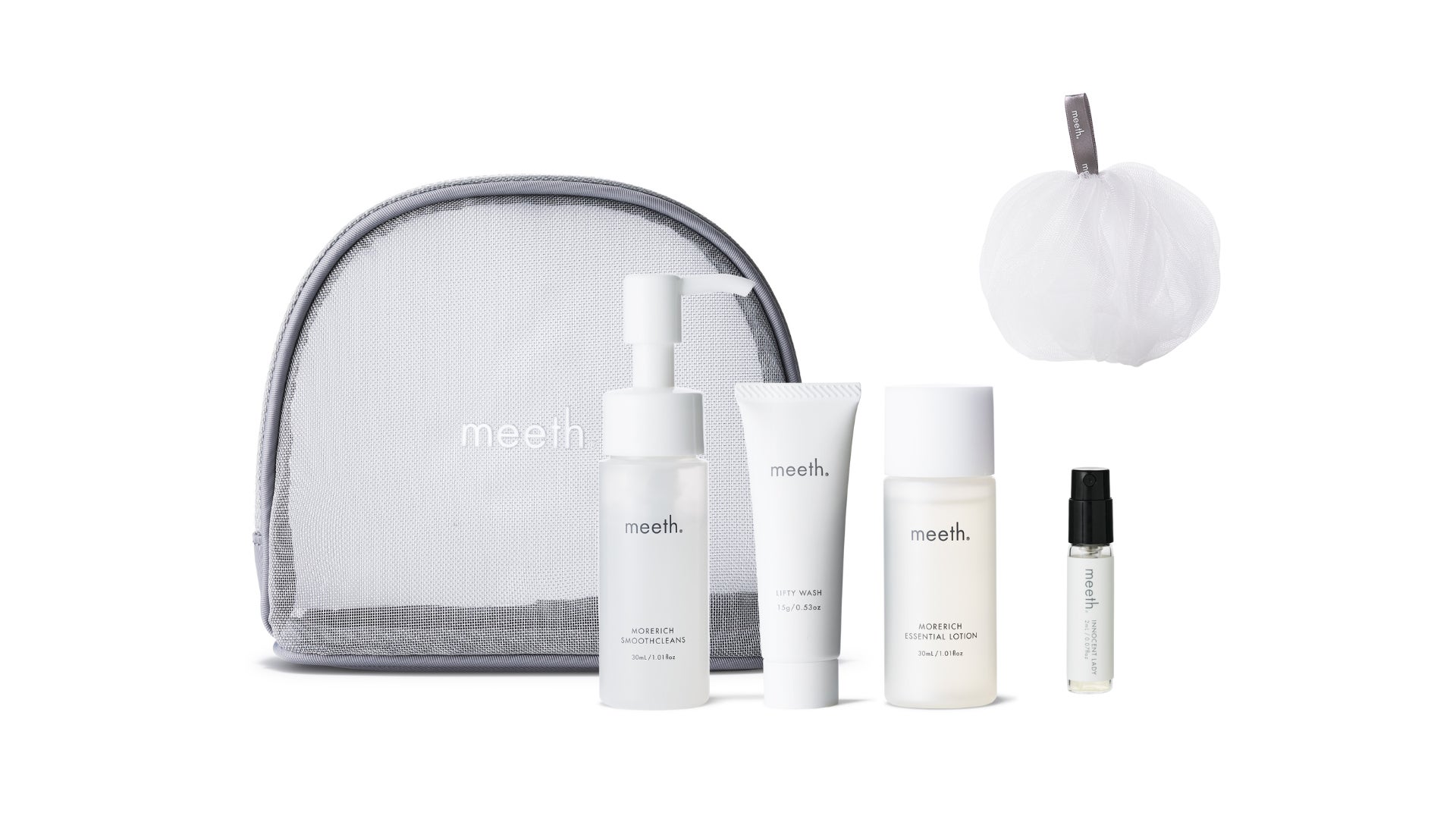 meethのスキンケアを7日間お試しいただける人気の「スターターセット」に加え、リフティウォッシュをふんわりと弾力のある泡に仕上げるオリジナルの「洗顔ネット」(現品)、そしてmeeth 5周年記念時に発売し即完売となった「イノセントレディ(オードパルファン)」のミニサイズ(2mL)を組み合わせた特別限定セットです。