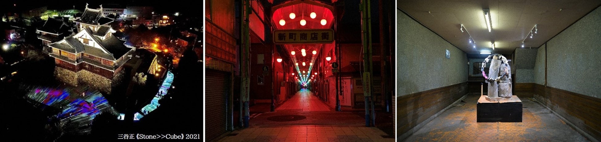 昼の部/夜の部の二部構成で、昼は彫刻家・花岡伸宏さんによる、新町商店街で地域とアーティストとの交流から日々変容していく彫刻展『記憶と立ち上げ』、夜はアーティスト・三谷正さんにより、福知山城と新町商店街で大規模な「光」のメディアアート/インスタレーション作品『subsurface: L350/C250』が展開されます。福知山城をぐるりと囲む250mのプロジェクションマッピングとともに、アーケードに設置された200個以上の照明による、国内最大級となる350mの商店街イルミネーションアートにもご注目ください。