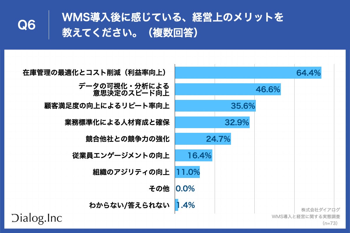Q5で「非常に感じている」「やや感じている」と回答した方に、「Q6.WMS導入後に感じている、経営上のメリットを教えてください。(複数回答)」(n=73)と質問したところ、「在庫管理の最適化とコスト削減(利益率向上)」が64.4%、「データの可視化・分析による意思決定のスピード向上」が46.6%、「顧客満足度の向上によるリピート率向上」が35.6%という回答となりました。