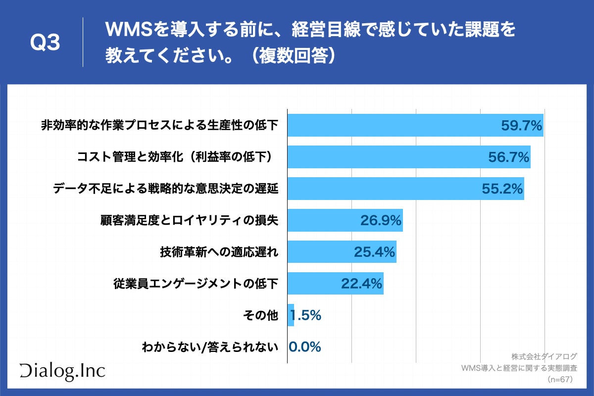 Q2で「かなりあった」「ややあった」と回答した方に、「Q3.WMSを導入する前に、経営目線で感じていた課題を教えてください。(複数回答)」(n=67)と質問したところ、「非効率的な作業プロセスによる生産性の低下」が59.7%、「コスト管理と効率化(利益率の低下)」が56.7%、「データ不足による戦略的な意思決定の遅延」が55.2%という回答となりました。