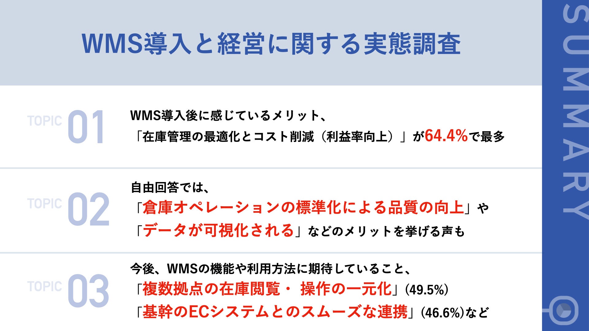 まず、約7割の企業が、WMS導入から「5年以上」経過しており、WMS導入前には、65.0%が「経営目線」の課題を抱えていたことが分かりました。その課題の内容としては、「非効率的な作業プロセスによる生産性の低下」(59.7%)、「コスト管理と効率化(利益率の低下)」(56.7%)が上位に挙がっています。また、70.9%が、WMS導入後に「経営上のメリット」を実感しており、具体的なメリットとしては、「在庫管理の最適化とコスト削減(利益率向上)」が64.4%で最多となりました。自由回答では、「倉庫オペレーションの標準化による品質の向上」や「データが可視化される」などのメリットを実感する声も寄せられています。さらに、約半数の企業が、WMS導入後に「倉庫管理のコストが減少」しており、今後WMSに対して、「複数拠点の在庫閲覧・ 操作の一元化」(49.5%)、「基幹のECシステムとの連携がスムーズにできる」(46.6%)などの機能に期待していると回答しました。