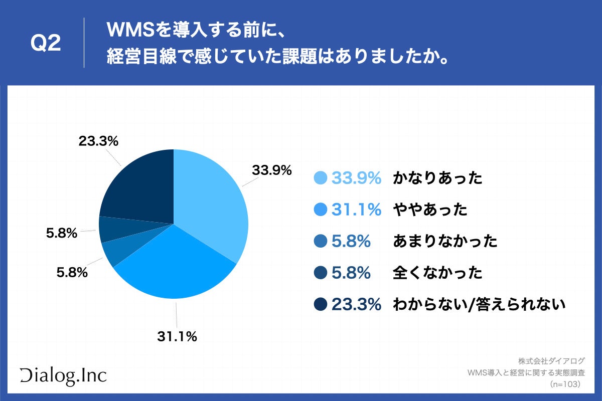 「Q2.WMSを導入する前に、経営目線で感じていた課題はありましたか。」(n=103)と質問したところ、「かなりあった」が33.9%、「ややあった」が31.1%という回答となりました。