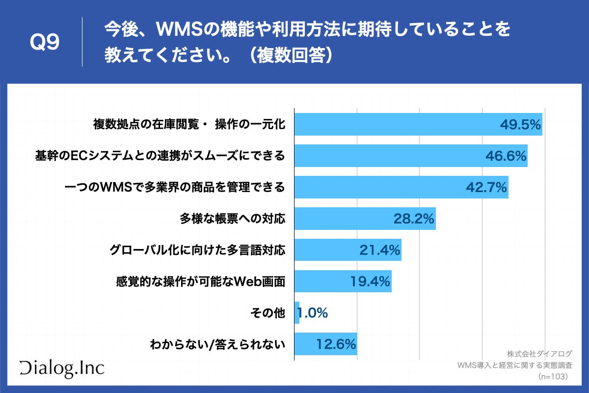 「Q9.今後、WMSの機能や利用方法に期待していることを教えてください。(複数回答)」(n=103)と質問したところ、「複数拠点の在庫閲覧・ 操作の一元化」が49.5%、「基幹のECシステムとの連携がスムーズにできる」が46.6%、「一つのWMSで多業界の商品を管理できる」が42.7%という回答となりました。