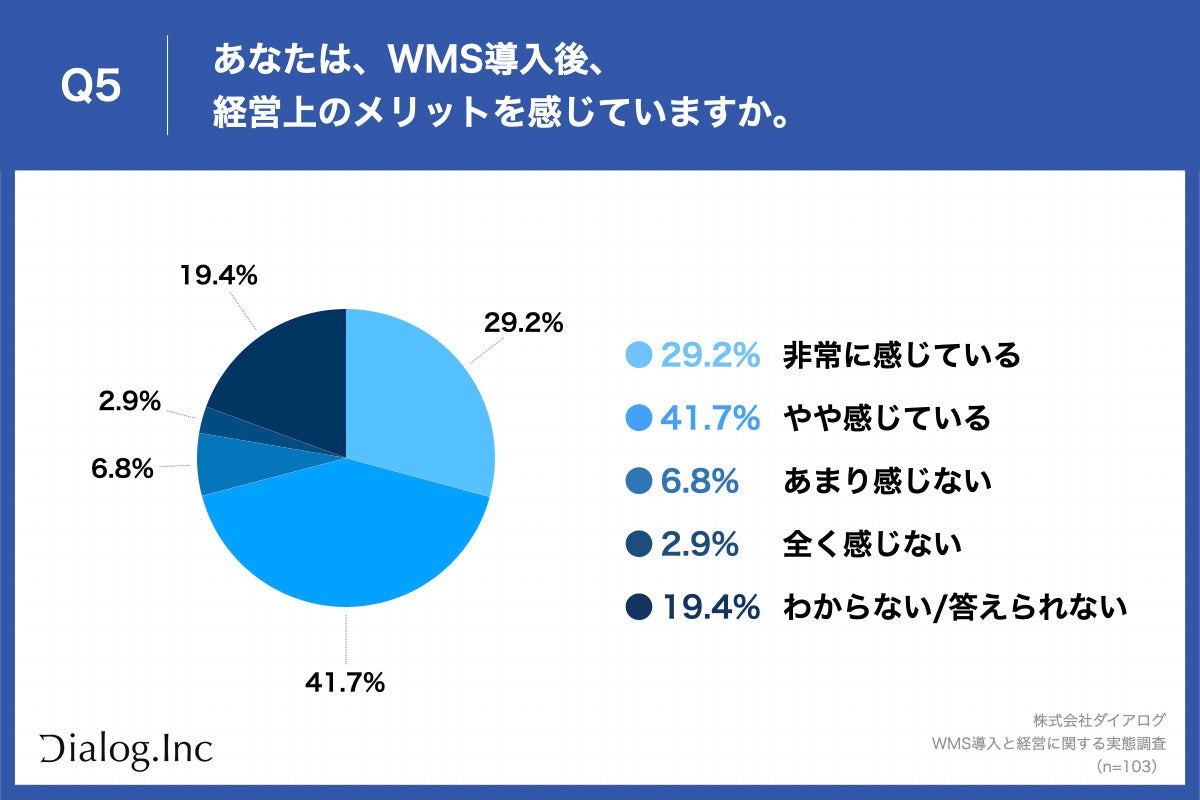 「Q5.あなたは、WMS導入後、経営上のメリットを感じていますか。」(n=103)と質問したところ、「非常に感じている」が29.2%、「やや感じている」が41.7%という回答となりました。