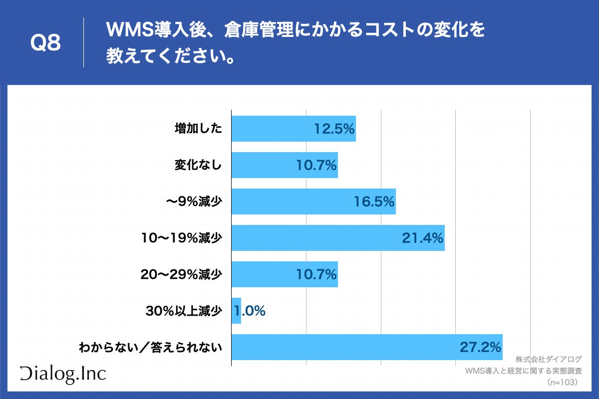 「Q8.WMS導入後、倉庫管理にかかるコストの変化を教えてください。」(n=103)と質問したところ、「10~19%減少」21.4%、「~9%減少」が16.5%という回答となりました。