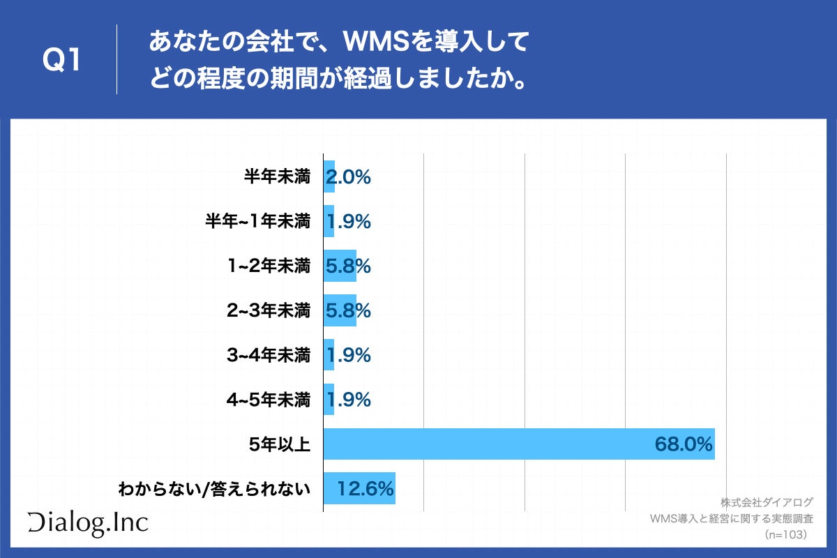 「Q1.あなたの会社で、WMSを導入してどの程度の期間が経過しましたか。」(n=103)と質問したところ、「5年以上」が68.0%、「1~2年未満」が5.8%、「2~3年未満」が5.8%という回答となりました。