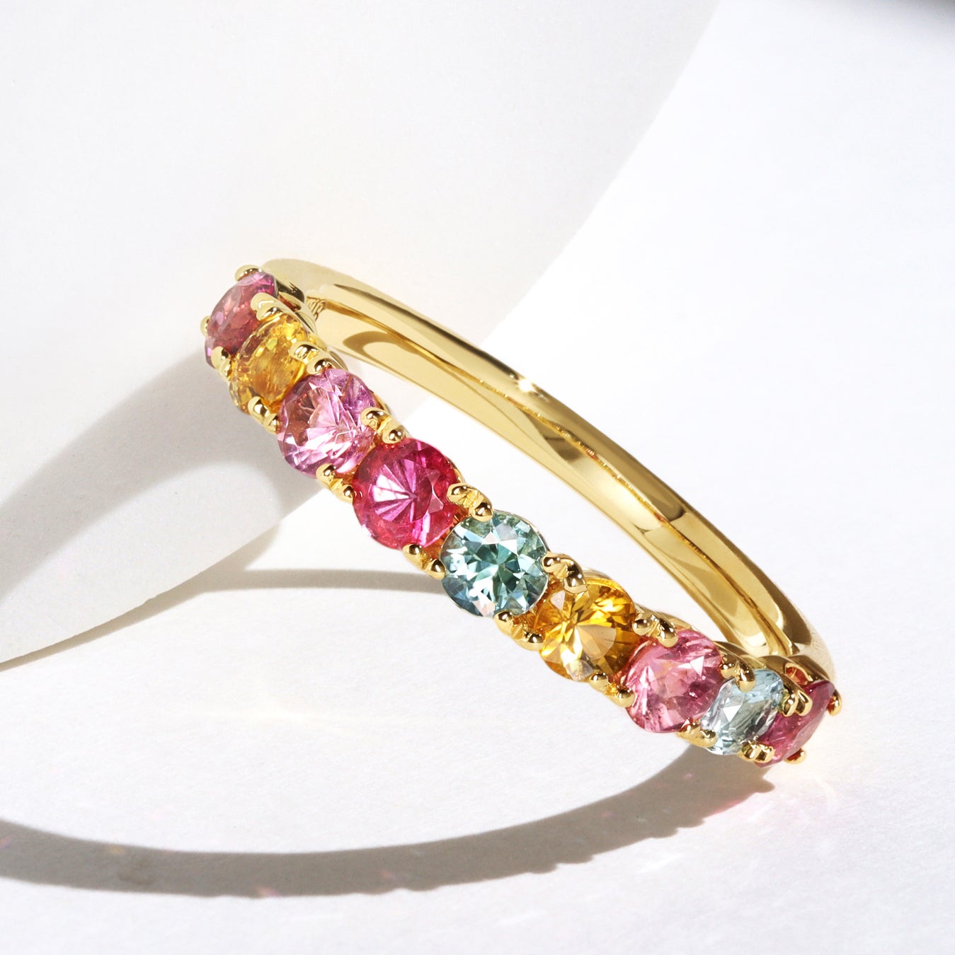 「マルチカラートルマリン・エマL」は、ビズーの人気エタニティリング「エマ」シリーズに、異なる色合いを持つ「トルマリン」を9石配した、存在感のあるアイテム。心が踊るカラーリングは、1本でもコーディネートの主役になってくれるはず。