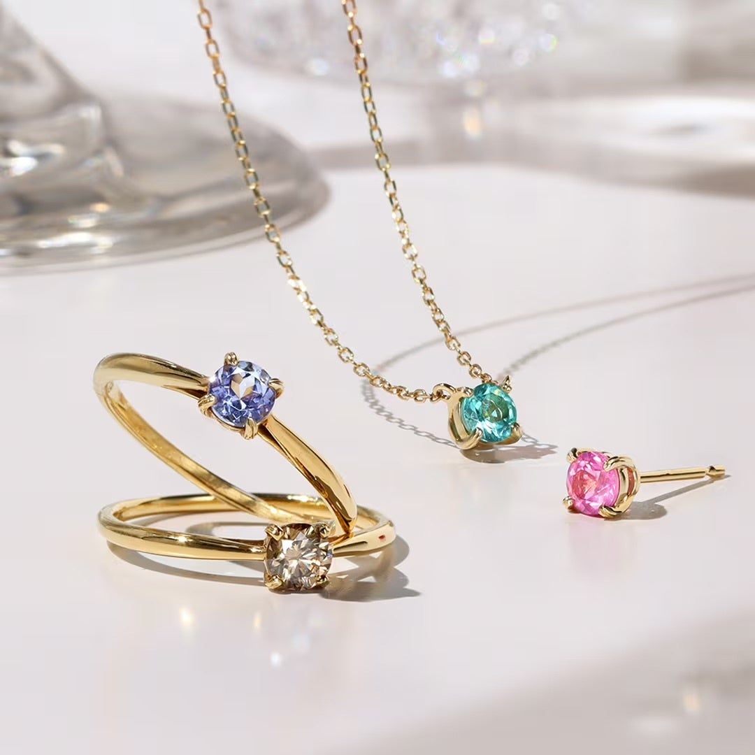 最大の特長は、ジュエリーブランドとして国内最多級のラインアップを誇る、天然のカラーストーン(色石)の取り扱い種類です。日本を含む世界20カ国以上から買い付けるカラーストーンは、常時100種類以上を宝飾品にして販売しています。