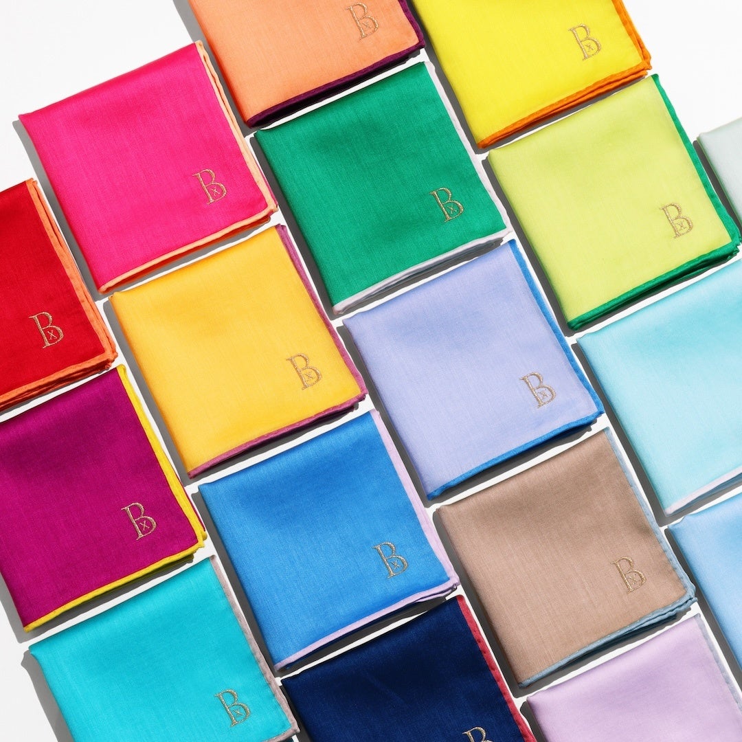 「カラーカクテル」シリーズで取り扱う宝石からインスピレーションを受けたハンカチは、全20色の展開。どの宝石の色が手元に届くかも、お楽しみいただけます。