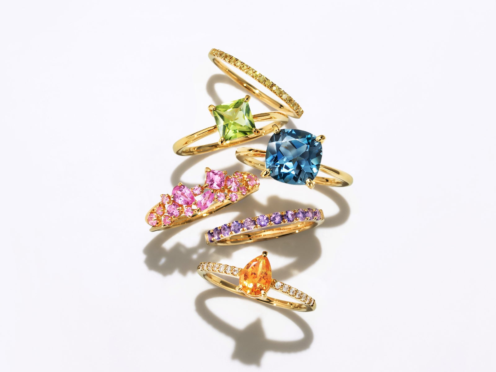 「カラーカクテル」は、全50色から選べる4ミリ大の宝石を主役に、ミニマルなデザインを楽しめるスキンジュエリーです。お気に入りのカクテルを作るように、お好きな色を重ねづけして、ファッションのポイントとしてもお使いいただけます。リング・ネックレス・ピアスの展開で、地金のカラーはイエローゴールド、ピンクゴールド、プラチナの3種からお選びいただけます。