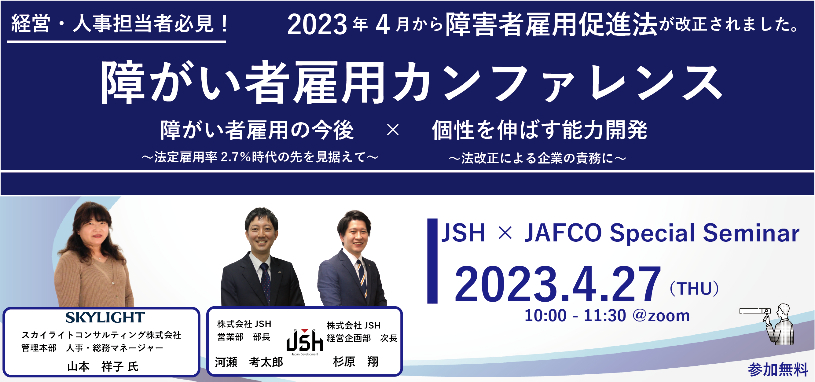 障がい者雇用カンファレンス開催決定! ~障がい者雇用の環境認識×法改正(雇用の質と2.7%時代)への対応~ 株式会社JSH×ジャフコグループ株式会社