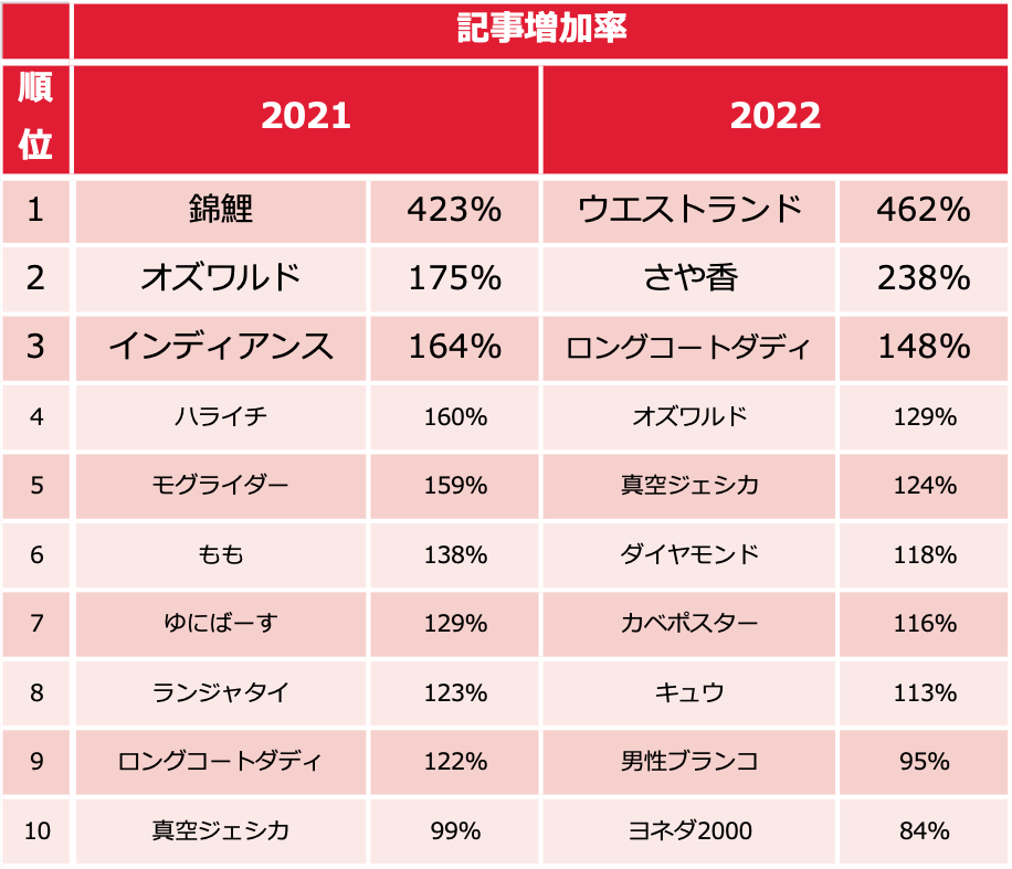 2021年大会後の調査結果では、審査順位が下位のモグライダーやランジャタイが記事などの数値と増加率で中位以上に来ていました。しかし、2022年大会でそうした現象は見られませんでした。