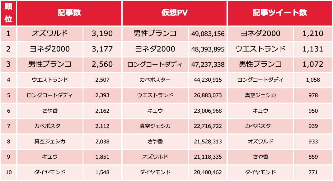 記事数・仮想PV2位、記事ツイート数1位のヨネダ2000は、12月10日に行われた『THE W 2022』決勝が大きく影響しました。