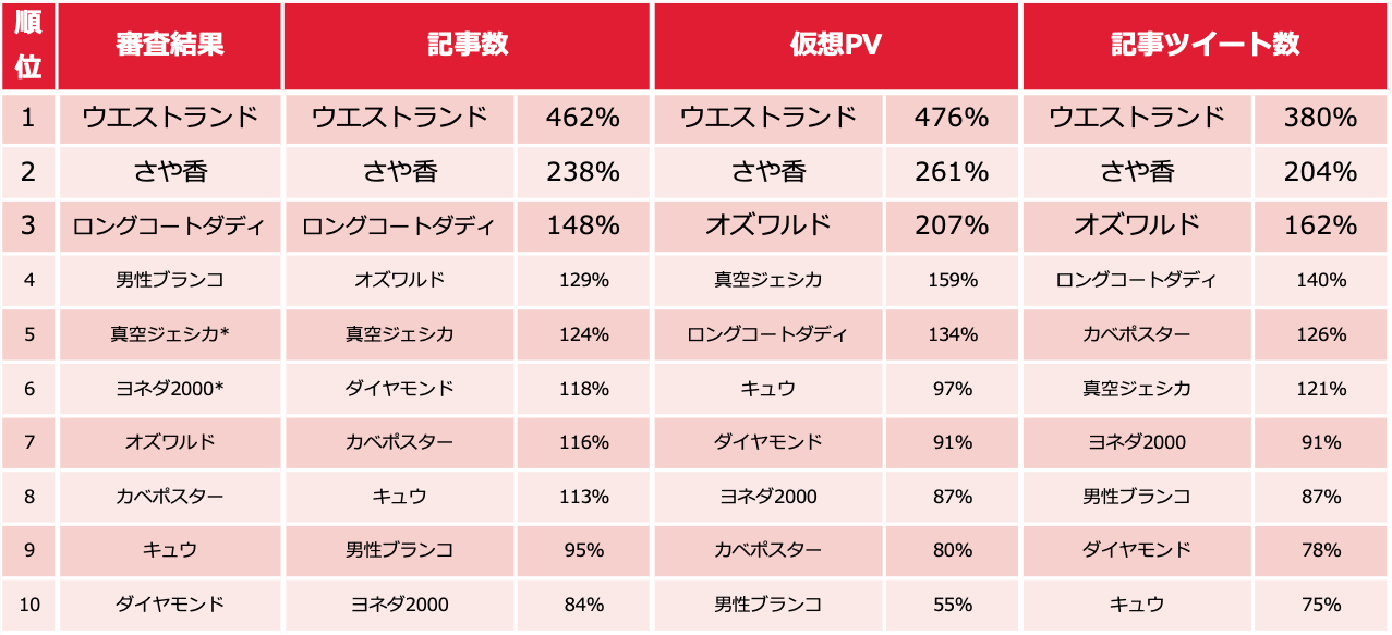 Qlipperのデータでは、記事数・仮想PV・記事ツイート数、そしてそれらの大会前からの増加率もすべてウエストランドが1位です。大会前後の1ヶ月ずつで比べると、記事数が約460%、仮想PVが約480%増えています。