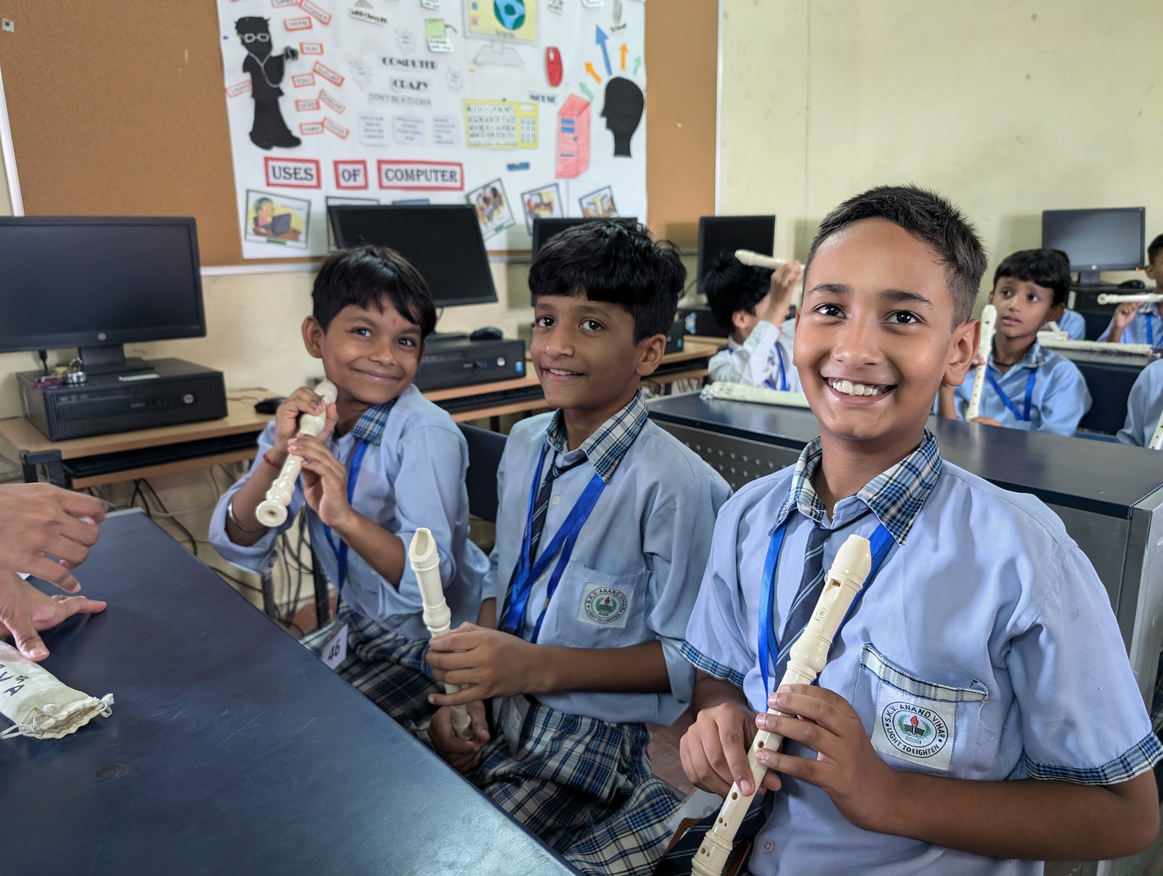 インドにおいて、ヤマハは、2023年4月よりデリー州の公立小学校10校にて、リコーダーを使った日本型音楽教育のパイロット授業を実施しています。授業では日本型音楽教育の特色である4分野の1つ「器楽」をメインに用いつつ、「歌唱・鑑賞・音楽づくり」も併せて実施、ペアワークなど協働活動や探究活動を多く取り入れ「主体的・対話的で深い学び」を実践することで、海外での日本型教育の認知度向上と国際化に寄与します。また、日本型音楽教育による「非認知能力」育成の効果を、授業期間(2024年7月~12月)の事前・事後で「Ai GROW」を用いて測定し、その教育効果を検証します。これらの活動を通じて、日本型音楽教育の有効性の検証、エビデンスの収集、そしてインドの公立小学校における教育の質の向上を目指しています。