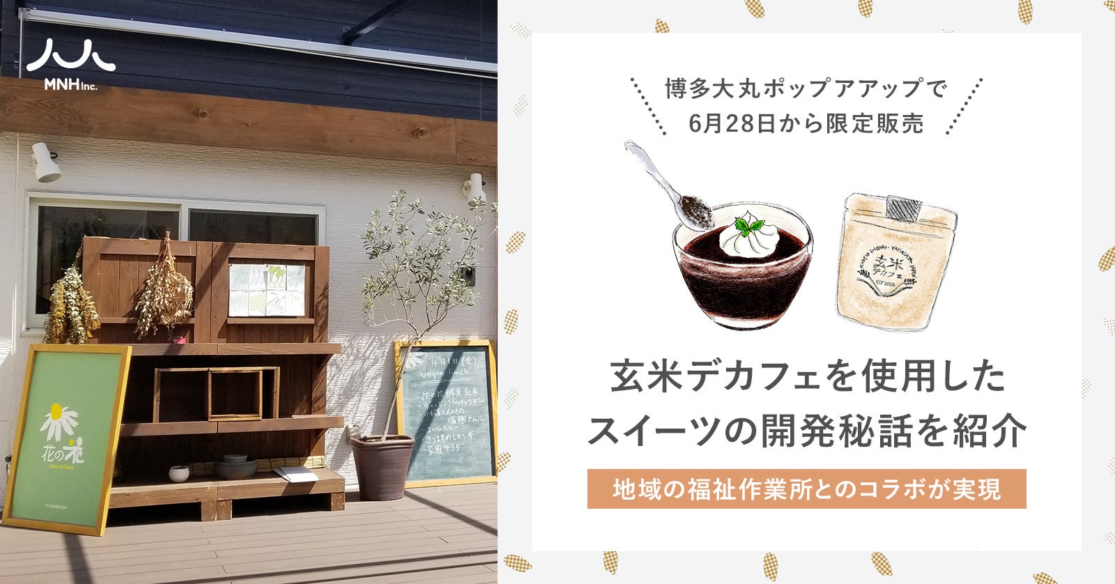 MNHとNPO法人「花の花」が、協力して商品化を進める様子を綴った「開発の裏側」を当社noteで公開しております。MNHと福祉作業所が、試行錯誤を重ねながら作った玄米デカフェの新作スイーツをぜひ店頭でお試しください。