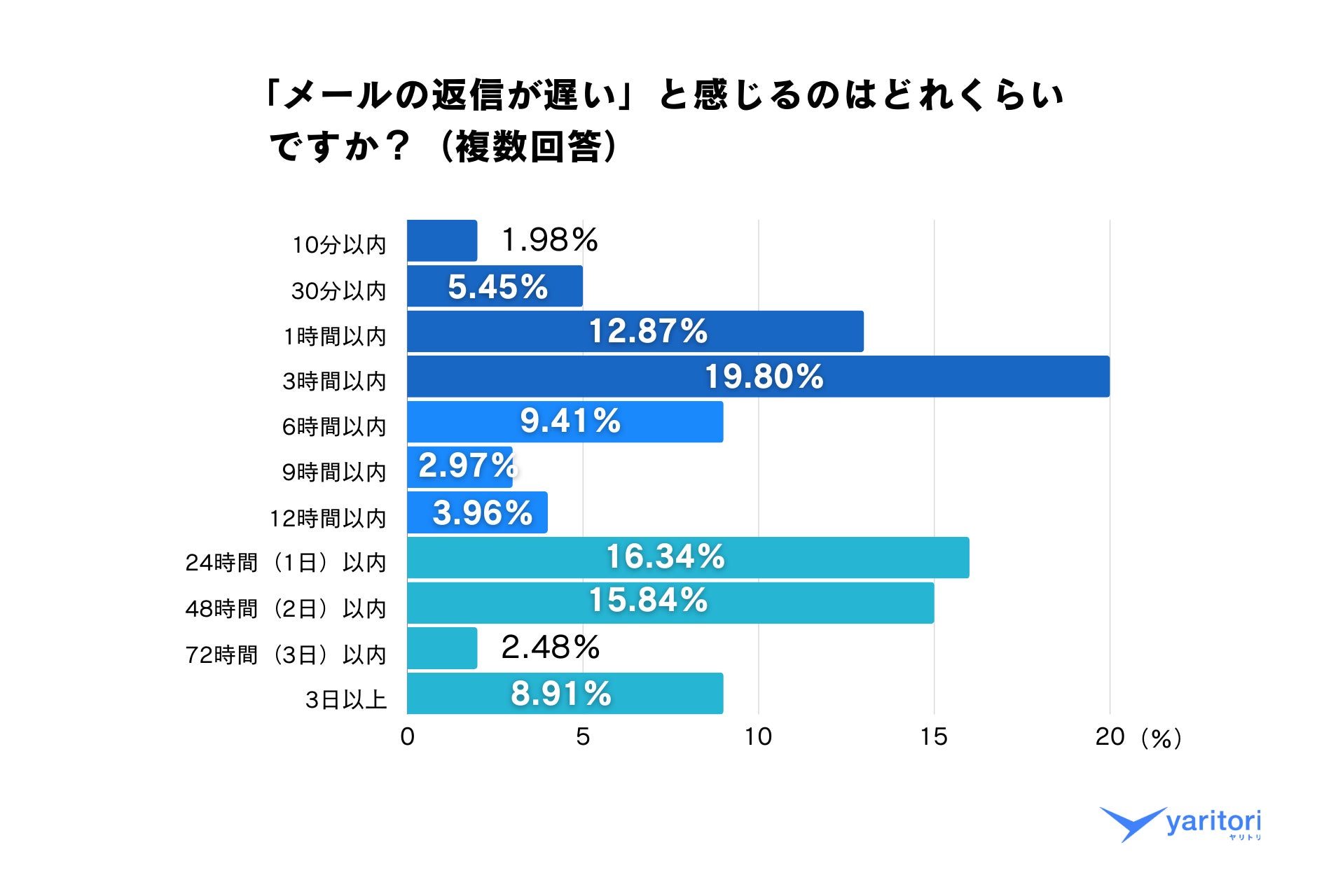 メール送信後、「3時間以内の返信でも遅いと感じる人」は40.1%にのぼり、そのうちの約半数は「1時間以内」と回答しました。
