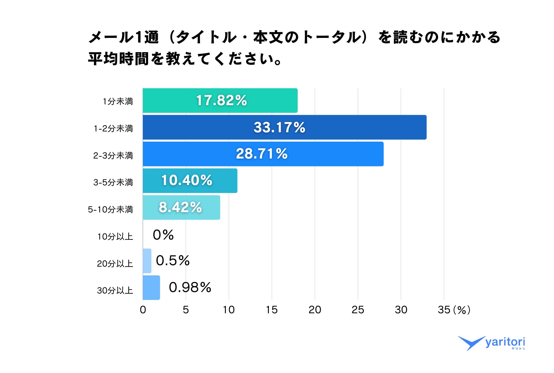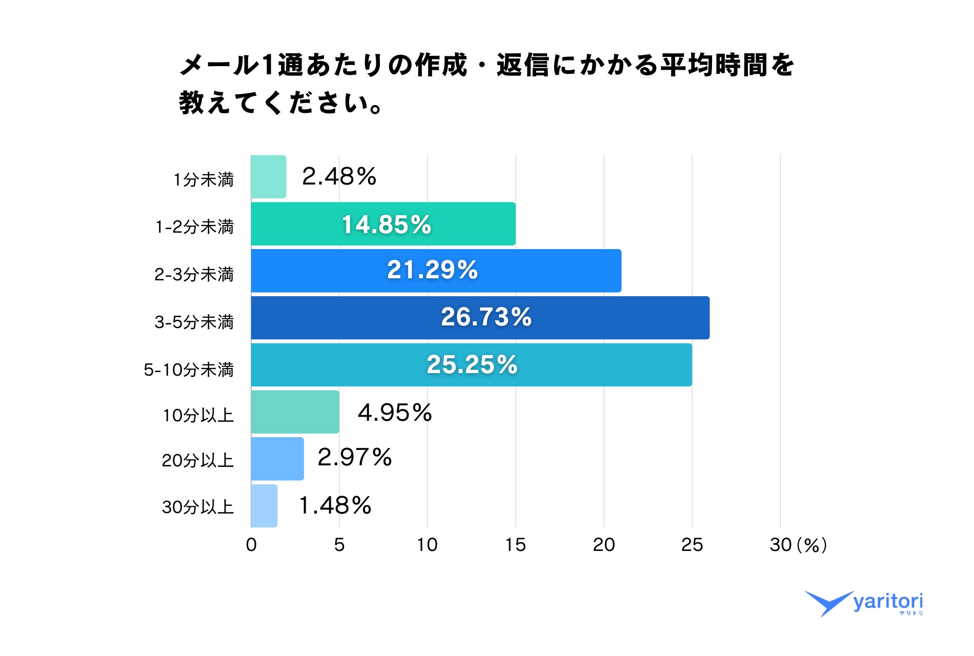メール1通あたりを読むのにかかる時間は1〜2分未満、作成・返信にかかる時間は3〜5分未満という結果になりました。
