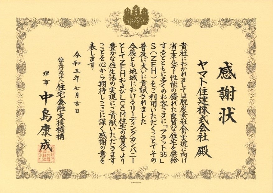 注文住宅を手がけるハウスメーカーのヤマト住建株式会社(本社:兵庫県神戸市、代表取締役:中川 泰、以後「ヤマト住建」)は、独立行政法人住宅金融支援機構(本店:東京都文京区、以後「住宅金融支援機構」)より感謝状を頂きました。