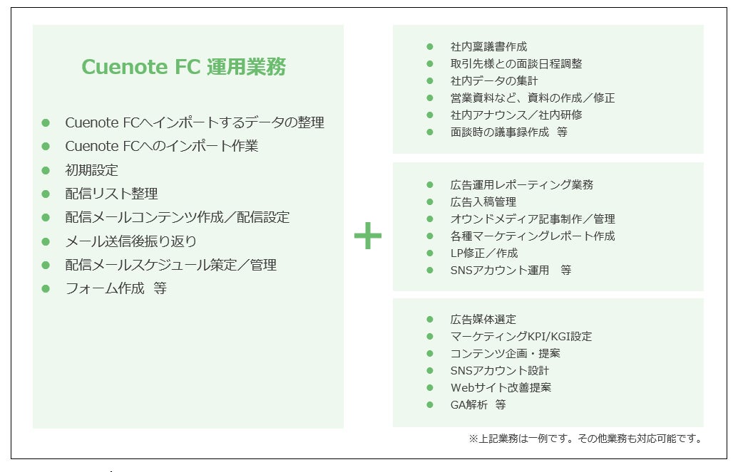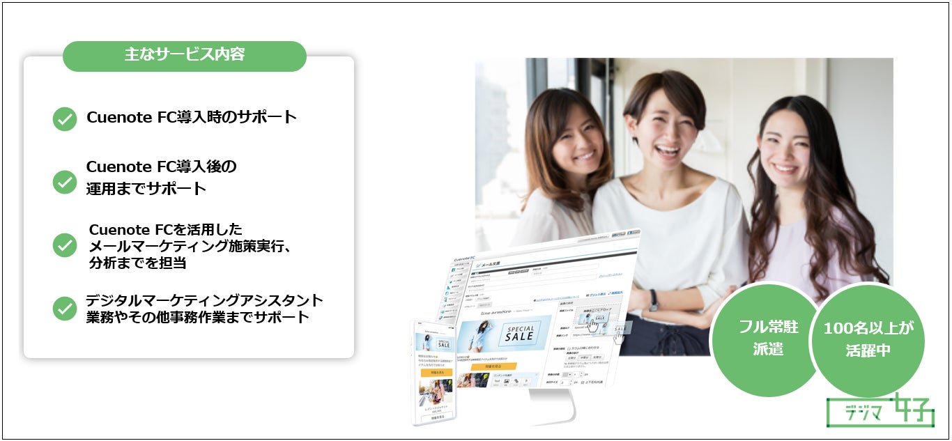 デジタルマーケティングの知識が豊富な「デジマ女子」が、メール配信システム「Cuenote FC」の導入から運用、デジタルマーケティング業務のサポートまでを伴走支援することで、企業のデジタルマーケティング業務におけるリソース不足解消と運用の定着化を図ります。