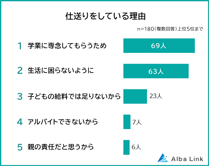 お子さんに仕送りをしている親御さん180人に「仕送りしている理由」を聞いたところ、1位は「学業に専念してもらうため(69人)」でした。僅差の2位は「生活に困らないように(63人)」となっています。