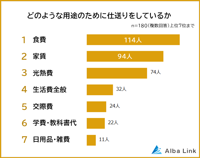 続いて親御さん180人に「どのような用途のために仕送りをしているか」を聞いた結果、1位は「食費(114人)」、2位「家賃(94人)」、3位「光熱費(74人)」となりました。